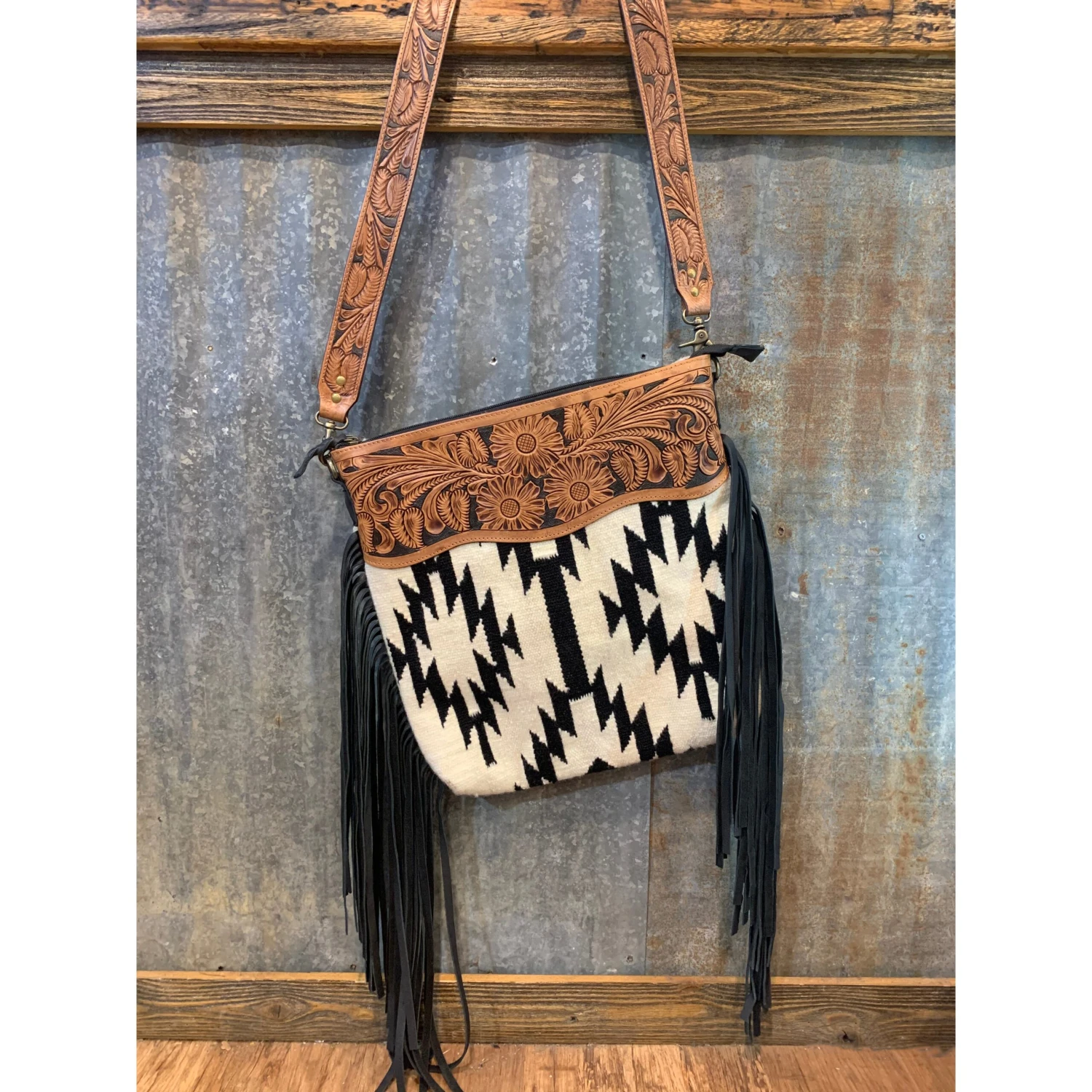 This bold black & white Aztec pattern is an eye catcher!! Trimmed with long black fringe & the tooled leather top is super cute!