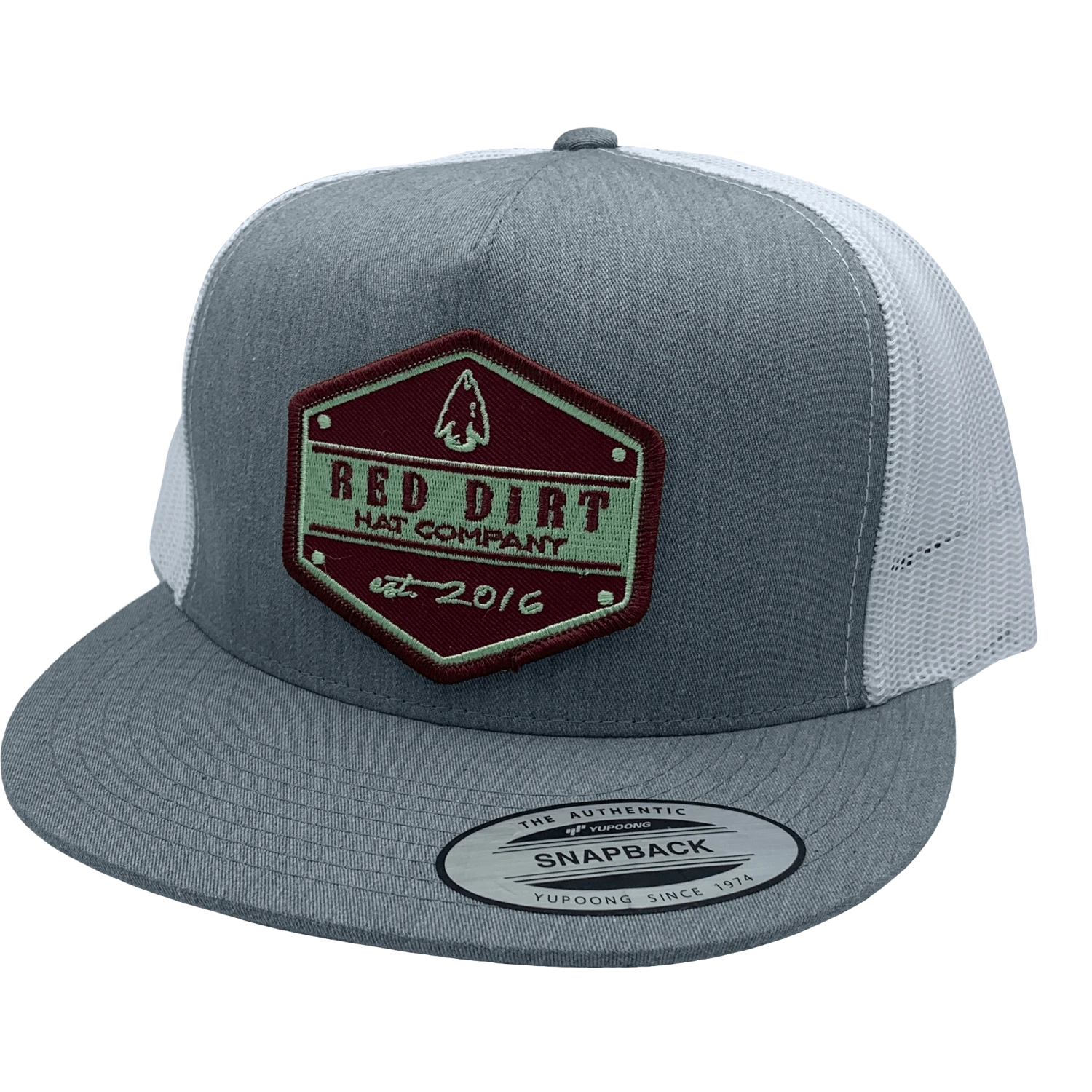 Heather grey and white Classic five panel style snapback cap featuring the “Arrow Head” patch