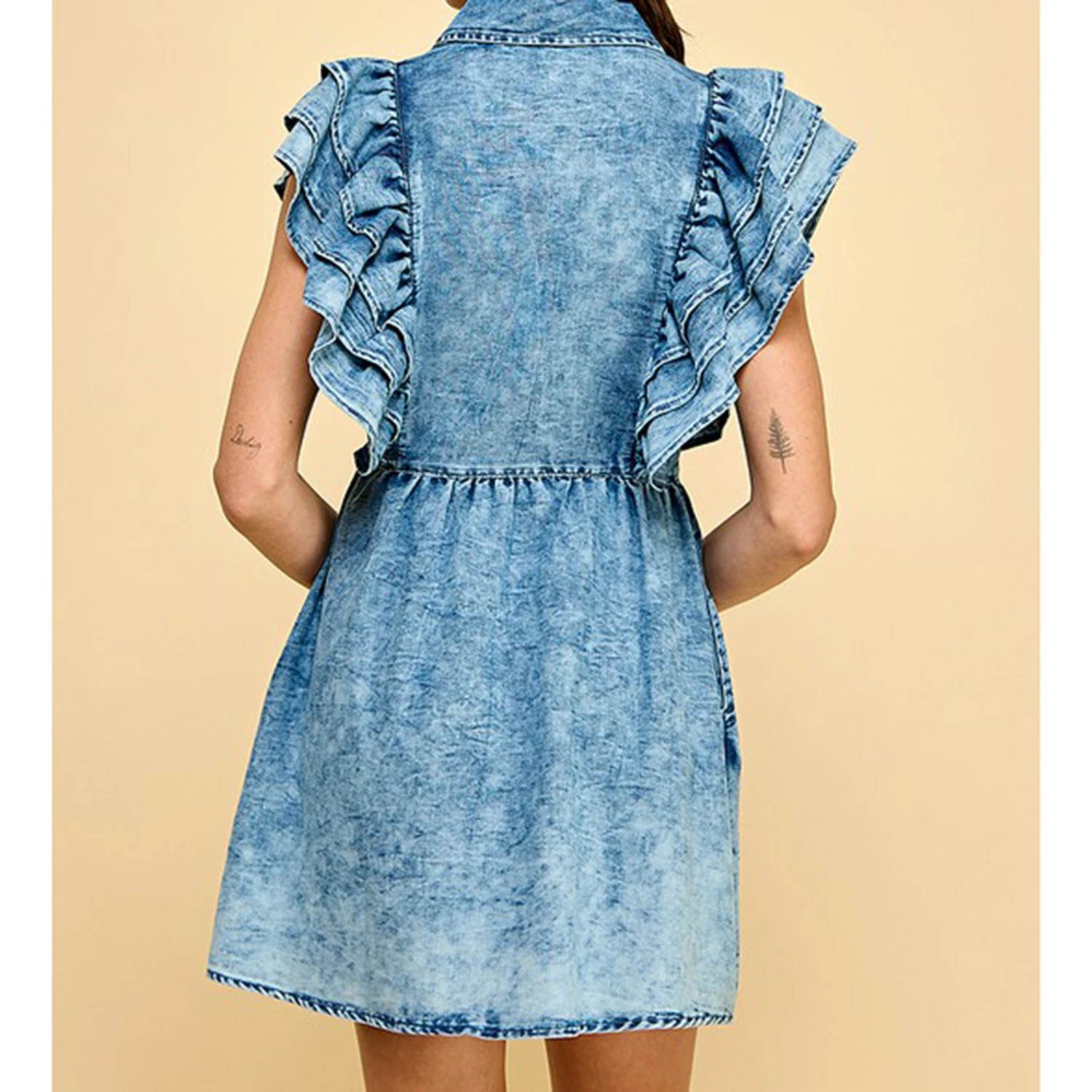 The ruffle sleeves accent this denim dress. It features an elastic waistband, side pockets, front button down and a classic collar. Wear alone or with some leggings.
