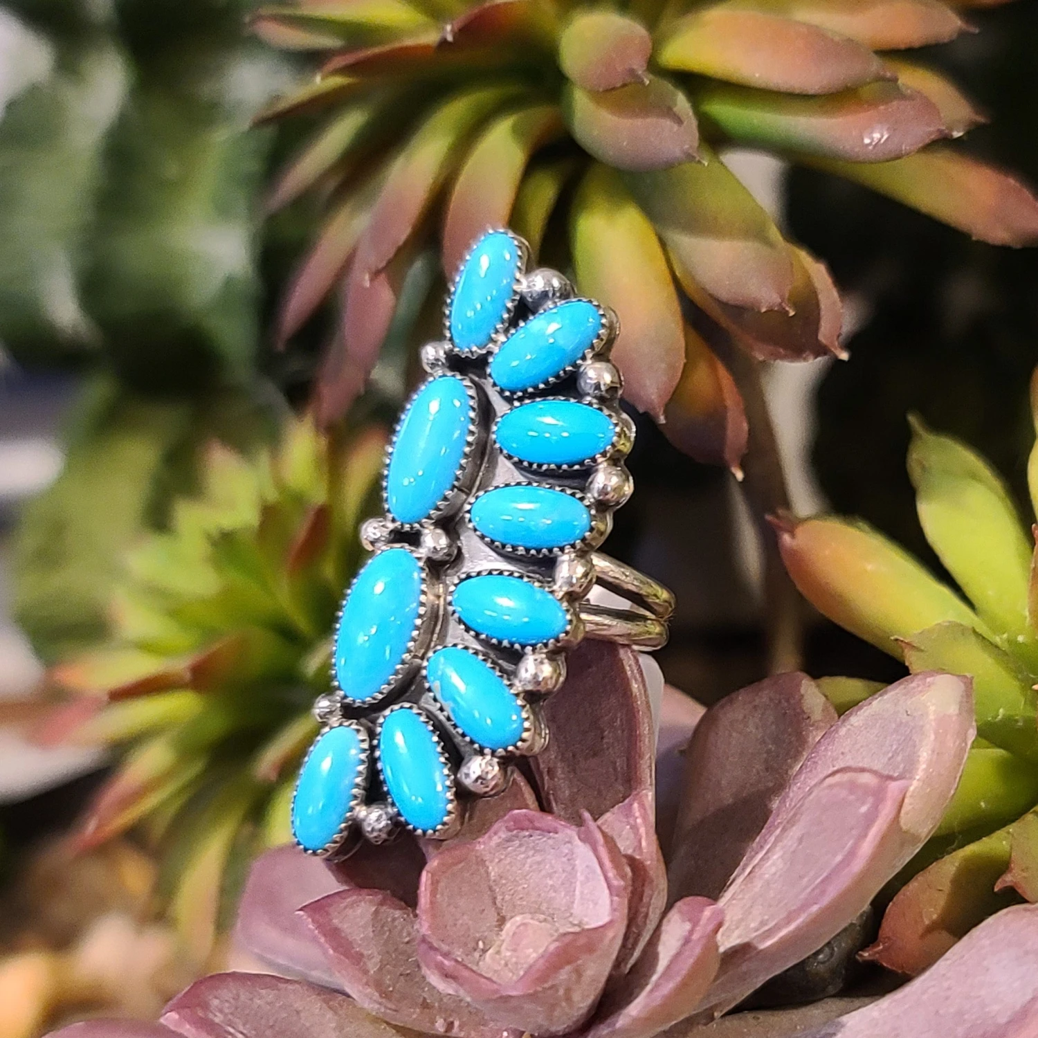 This is a statement piece right here. The 10 stone turquoise ring has a half moon shape and tons of character. At just over an inch it has a great size that