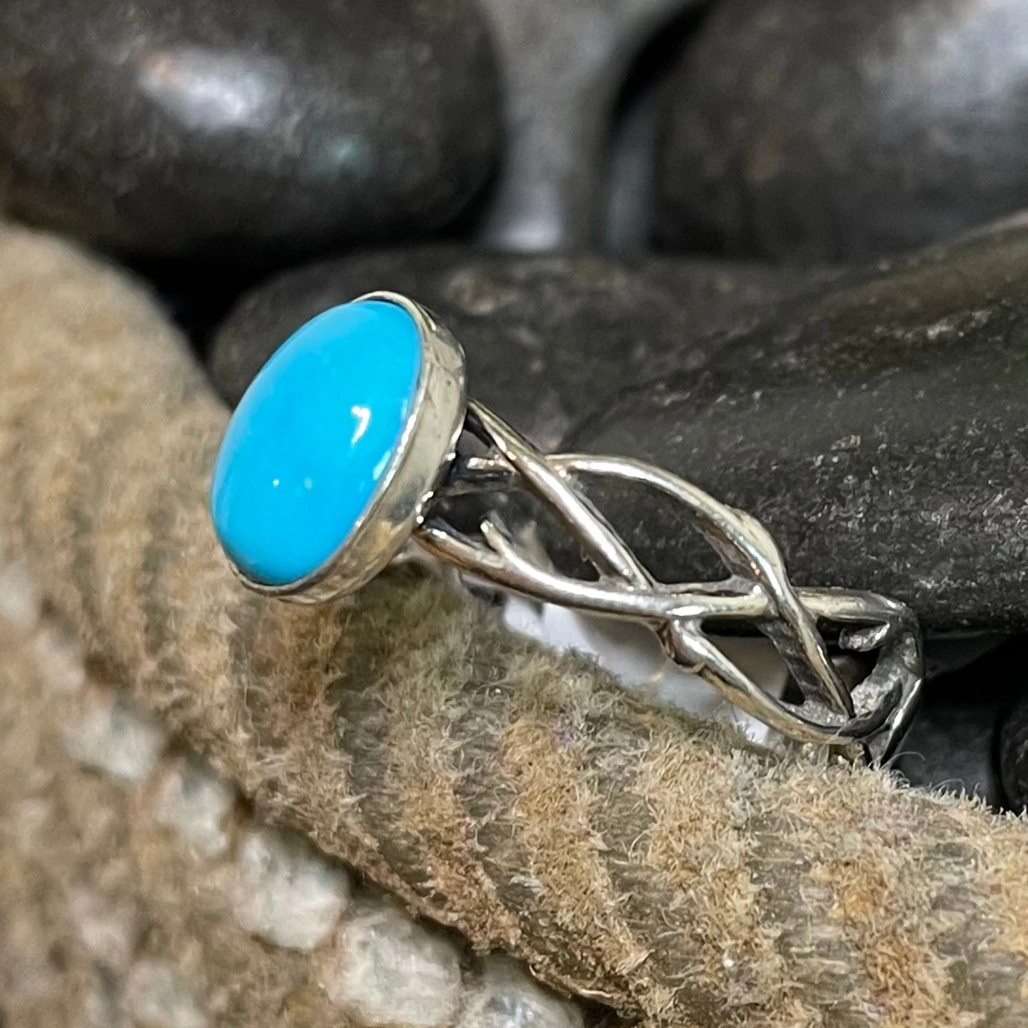 This dainty turquoise ring has so much character in the silver band. There are multiple sizes in this ring.Â