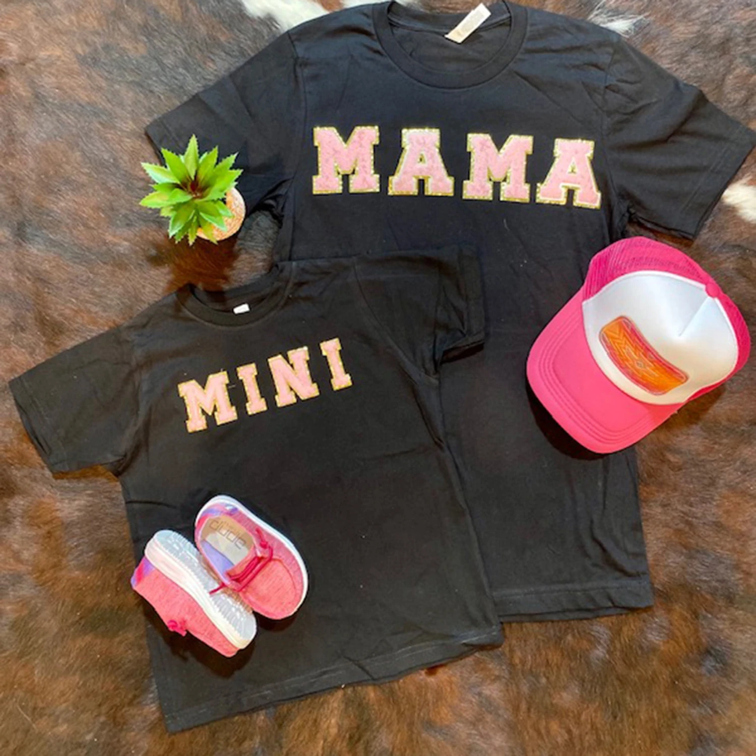 We love a great Mommy & Me and this adorable MINI black tee is a must have! Make sure to grab the matching MAMA version just for you! Pink Letters with Gold Trim, these tee’s are fun and fabulous.Â