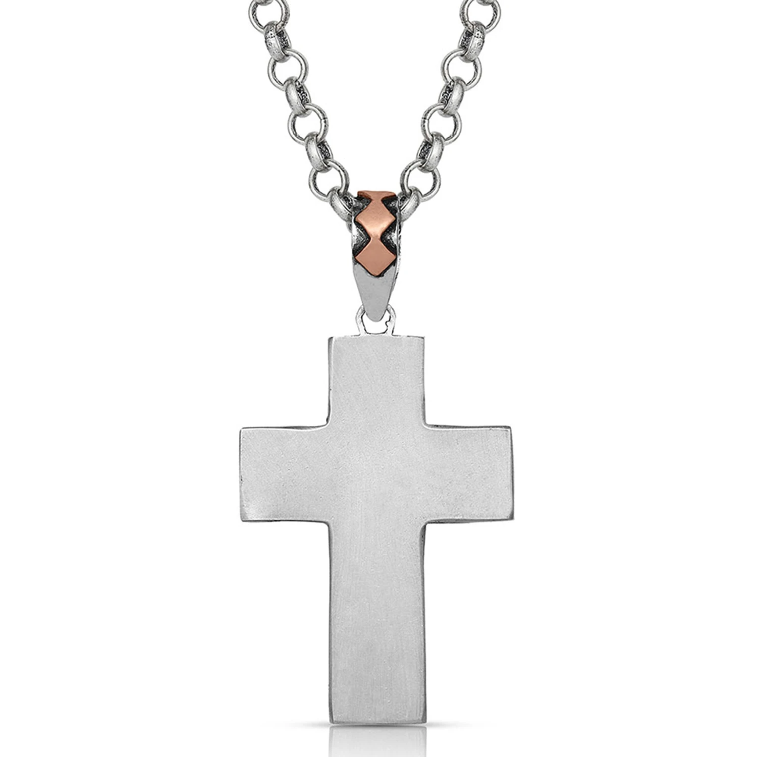 This Montana Silversmiths antiqued cross necklace is made of German silver and has a gold toned and copper accented trim. It has a small diamond-shaped turquoise stone in the center of the cross. It includes a 28″ antiqued silver chain.Â
