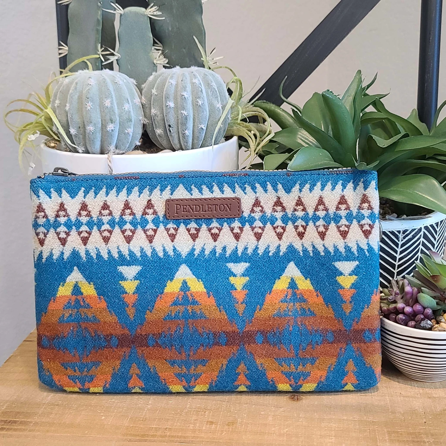 A trio of pockets hold and organize small essentials. Crafted from woven-in-USA wool jacquard, with a top zipper, and antiqued brass hardware. Leather logo patch. Pattern placement may vary.Â